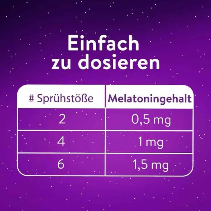- Einfache Anwendung: Wählen Sie Ihre Dosis, sprühen Sie 4 mal (1 mg Melatonin) bzw. bis zu 6 mal (1,5 mg Melatonin) 30 Minuten vor dem Zubettgehen direkt in den Mund, kein anschließendes Zähneputzen notwendig.