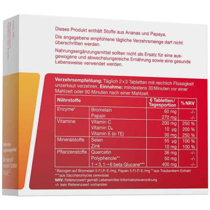 Füllstoff Cellulose; beta-Glucane aus Saccharomyces cerevisiae; Papain (enthält Sulfite); Vitamin C; Füllstoff Hydroxypropylcellulose; Traubenkern-Extrakt (Polyphenole); Bromelain; Quercetin; Vitamin E; Zinkcitrat; Trennmittel Fettsäuren, Magnesiumsalze von Speisefettsäuren und Siliciumdioxid; mittelkettige Triglyceride; Überzugsmittel Natriumalginat; Hydroxypropylmethylcellulose, Ethylcellulose, Polydextrose und Talkum; Maltodextrin; Gelatine; Stärke; Zucker; Farbstoff Titandioxid; Aroma; Natriumselenit; Vitamin D3.