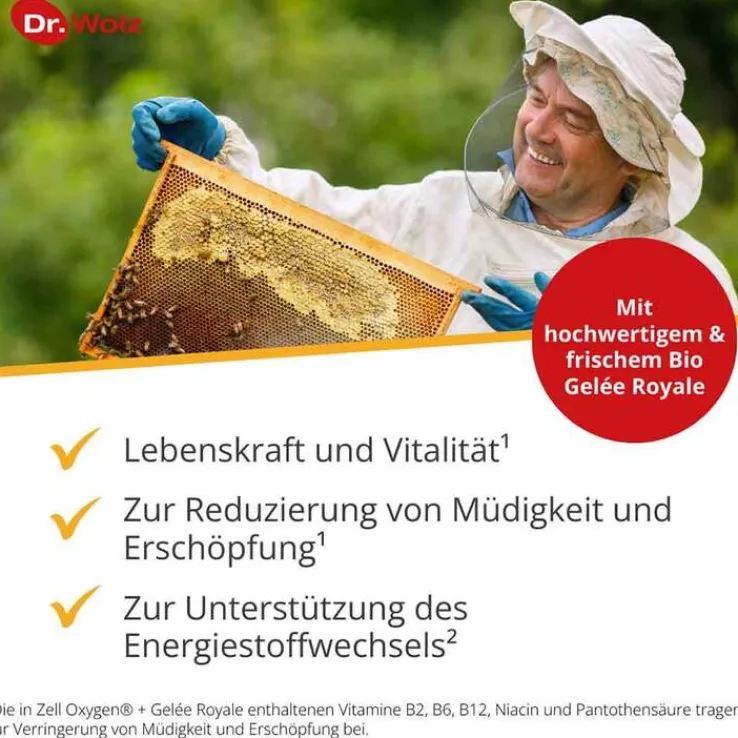 ¹ Die in Zell-Oxygen + Gelee Royale 600 mg Trinkampullen enthaltenen Vitamine B2, B6, B12, Niacin und Pantothensäure tragen zur Verringerung von Müdigkeit und Ermüdung bei.
