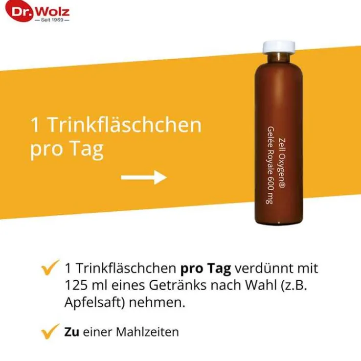 Zell Oxygen Gelee Royale ist ein Konzentrat , daher 1 Trinkfläschchen pro Tag verdünnt mit 125 ml eines Getränkes Ihrer Wahl (z.B. Fruchtsaft) zu einer Mahlzeit einnehmen.