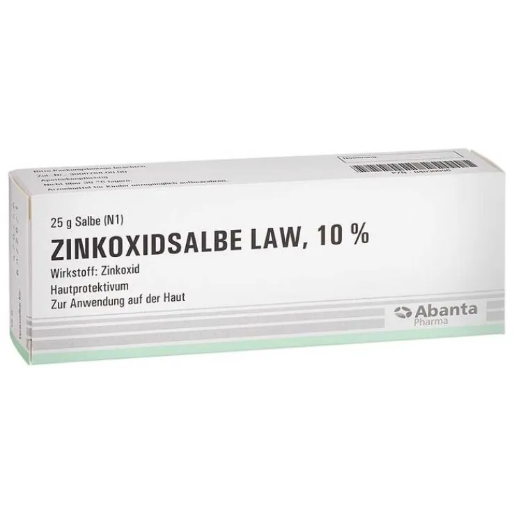 ZINKOXIDSALBE LAW, 10 %. Wirkstoff: Zinkoxid. Anwendungsgebiet: Zinkoxid wirkt abdeckend-protektiv und sekretbindend bei akuten und subakuten Dermatosen. Apothekenpflichtig. Zu Risiken und Nebenwirkungen lesen Sie die Packungsbeilage und fragen Sie Ihre Ärztin, Ihren Arzt oder in Ihrer Apotheke. Abanta Pharma GmbH